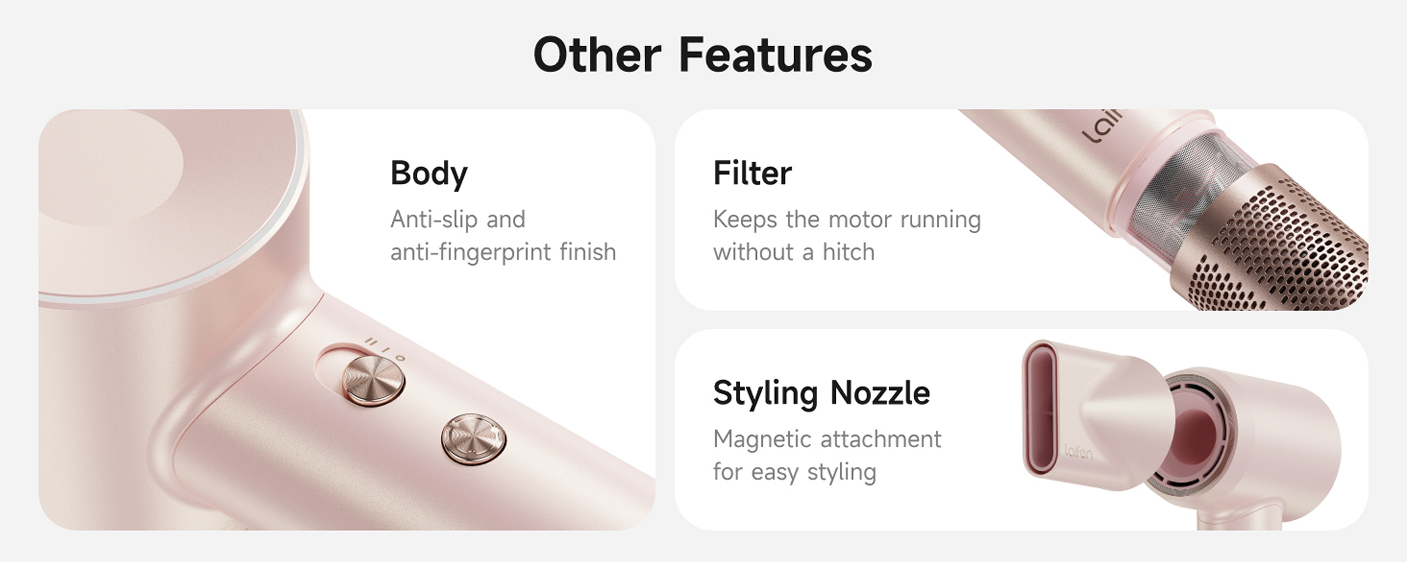- [Iconic Drying] Powered by Laifen's 110,000 RPM high-speed motor, the Premium produces 22m/s airspeeds that dry hair fast.